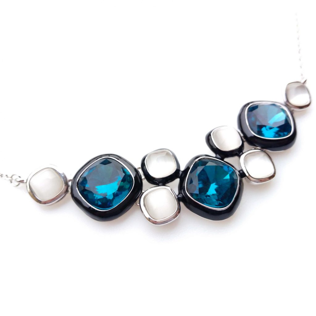 Collana dallo stile Classico e Intramontabile realizzati in Cristallo di Boemia e Bagnati in Oro Bianco 18k. Il Cristallo esposto alla Luce cambia Colore passando dal verde smeraldo al marrone, dal grigio al nero.
