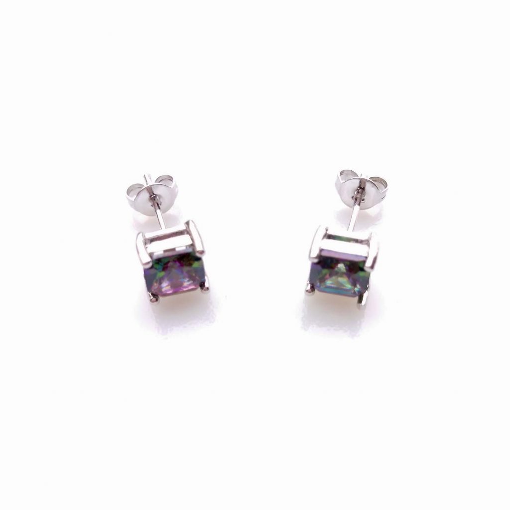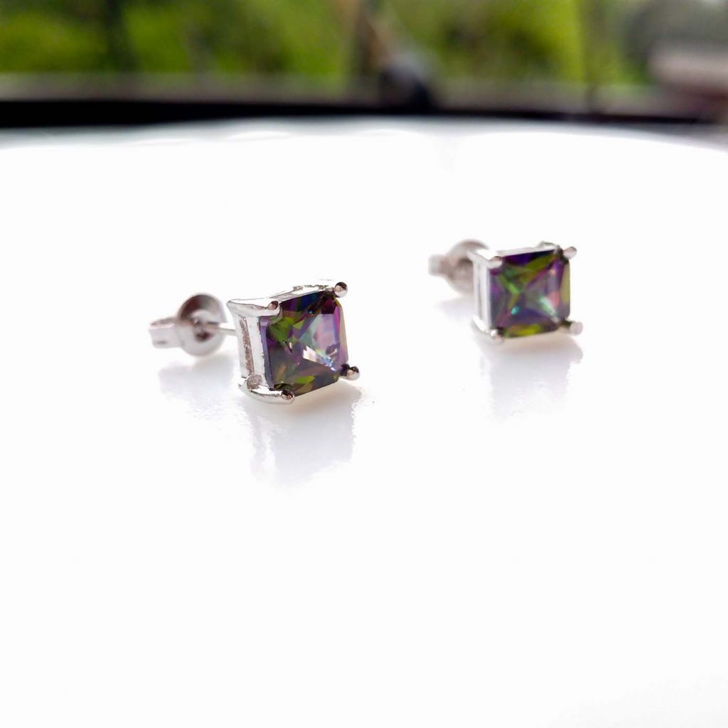 Orecchini Alta Bigiotteria Bagnati in Oro Bianco 18k con un Cristallo di Boemia multicolore. Il Cristallo esposto alla Luce cambia Colore passando dal verde smeraldo al viola, dal blu al rosa. Orecchini versatili da indossare in occasioni formali con Abiti Eleganti o per dare un tocco raffinato ad un abbigliamento più casual. "* Un Cubo pieno di Luce *"