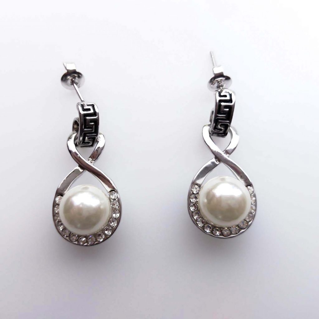 Orecchini Bagnati in Oro Bianco 18k con una Perla sintetica contornata da Zirconi. Un Motivo Etrusco unisce in questi orecchini il Gusto Classico al Design Moderno