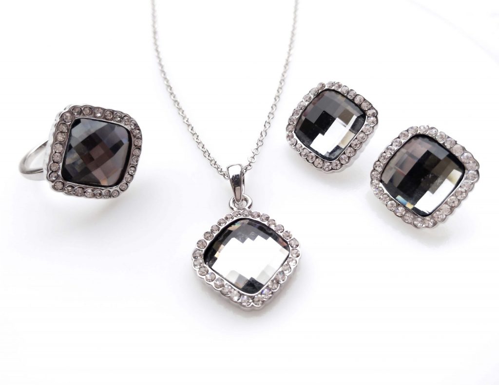 Parure dallo stile Classico e Intramontabile realizzati in Cristallo di Boemia e Bagnati in Oro Bianco 18k. Il Cristallo esposto alla Luce cambia Colore passando dal verde smeraldo al marrone, dal grigio al nero. La Parure è composta da Collana, Anello e Orecchini.